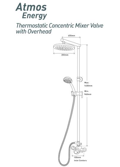 The MX Atmos Energy has, stylish looks and provides a luxurious showering experience. The diverter gives the choice between a multi mode handset and a large overhead spray. With its slender telescopic rail, the MX Atmos Energy conveys the latest in contemporary design. Fully thermostatically controlled Bar Mixer Valve with diverter overhead and separate multi mode showerhead. Separate Flow and Temperature Controls and Suitable for High and Low Pressure Systems. Easy Fit Kit (HMK) are available for this product (seperate purchase required).