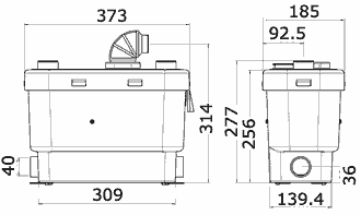 Watts (Consumption) 450 watts Horizontal Discharge max 70m Vertical Discharge 7 metres Gravity fall on horizontal installations 1/100 Discharge Pipe Diameter 32mm Working Temperature 35oC Maximum Temperature 60oC for short periods Materials polyethylene - grey Dimensions (vertical height is measured from floor level) w373mm h350mm d185mm Technote When used with a shower or bath, the shower tray or bath outlet has to be raised 15 cm above the floor. EuropeanStandard EN 12050-2 Alarm no Maintenance Access to motor by unclipping the lid.