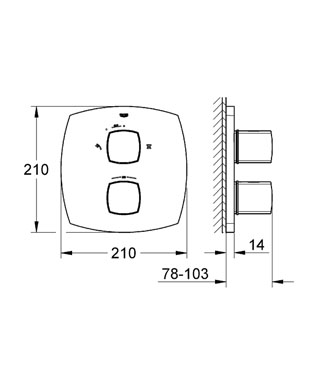 Grandera Thermostatic shower mixer with integrated 2-way diverter set for final installation for 35 500 000 / 35 050 000 Rapido T without concealed body GROHE StarLight® chrome finish GROHE SafeStop Plus safety stop at 38 C and additionally adjustable max. temperature limiter at 43 C GROHE AquaDimmer Eco with multiple function: shut off and flow control diverter: shower head/hand shower Integrated Eco-Button with Eco-Stop for shower wall escutcheon with GROHE SmartFix (covered escutcheon- and shaft sealing, covered fixing) metal handles min. recommended pressure 1.0 bar