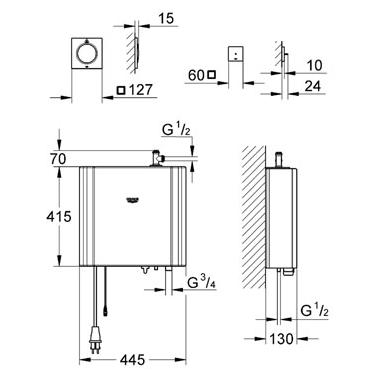 GROHE F-digital Deluxe Steam generator 2.2 kW with steam outlet and temperature sensor consisting of: steam generator 415 x 445 x 130mm suitable for steam rooms up to 2.5 m3 supply voltage 230 V AC, 50 Hz power 2.2 kW water inlet ¾“ operating pressure 1 – 5 bar (above pressure reducer) automatic emptying water outlet ½“ steam temperature: max. 55° C steam outlet ½“ type of protection IP 23 CE approved steam outlet module 127 x 127mm connection thread ½" temperature sensor module 60 x 60 x 12mm SpeedClean anti-lime system GROHE StarLight® chrome finish requires rough-in set (29 074 000) – to be ordered separately